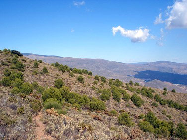 El territorio, muy escarpado, corresponde a laderas de las sierras nombradas. Entre la vegetación que se da en la zona, se incluyen los pinares de repoblación y encinares, junto con cultivos de secano en las laderas.