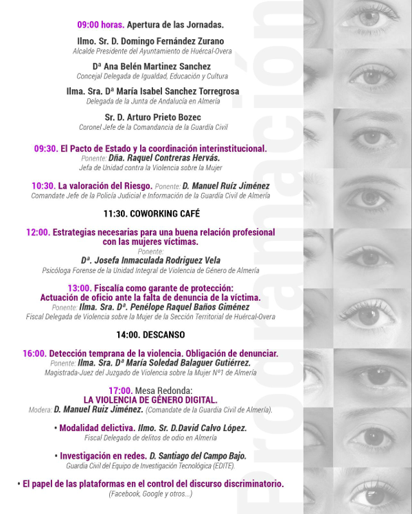 El programa se iniciará alas 09:00horas con la apertura de las jornadas a cargo del Alcalde, Domingo Fernández Zurano, la concejal de Igualdad, Belén Martínez, la Delegada del Gobierno de la Junta de Andalucía en Almería, Maribel Sánchez, y el Coronel Jefe de la Comandancia de la Guardia Civil, Arturo Bozec. Tras la misma Raquel Contreras Jefa de la Unidad contra la Violencia de la Mujer tratará “El Pacto de Estado y la coordinación interinstitucional”, Seguidamente el Comandante Jefe de la Policía Judicial e Información de la Guardia Civil de Almería, Manuel Ruiz se encargará de “La valoración del Riesgo”. La Psicóloga forense de la Unidad Integral de la Violencia de Género de Almería, Josefa Inmaculada Rodríguez tratará “Las estrategias necesarias para una buena relación profesional con las mujeres víctimas”. Finalizando la jornada de mañana la Fiscal delegada de violencia sobre la Mujer de la Sección Territorial de Huércal-Overa, Penélope Raquel Baños con la ponencia sobre “Fiscalía como garante de protección: Actuación de oficio ante la falta de denuncia de la víctima”.